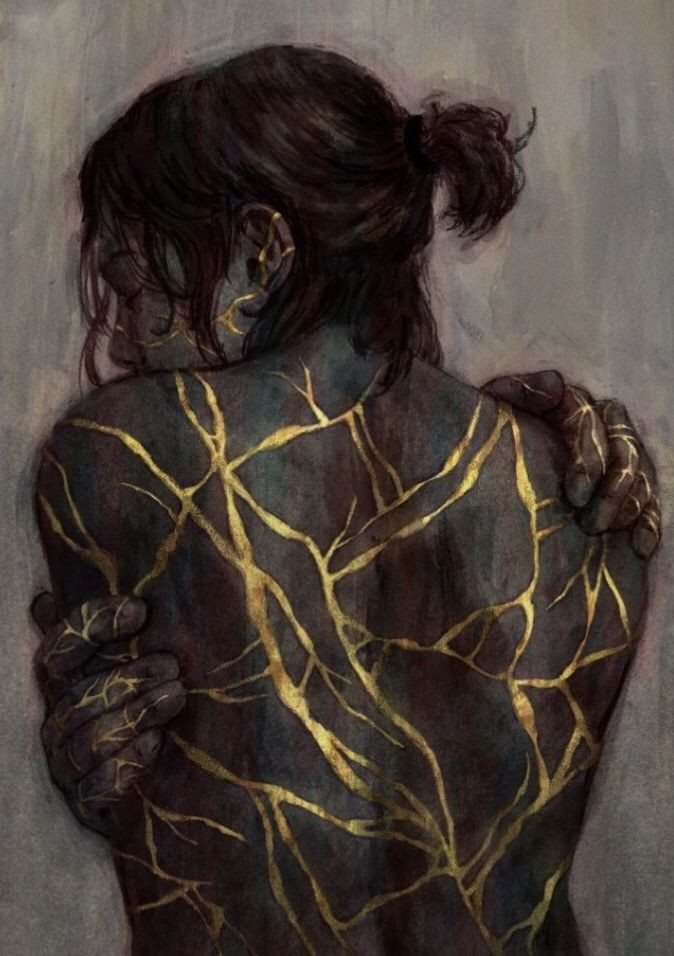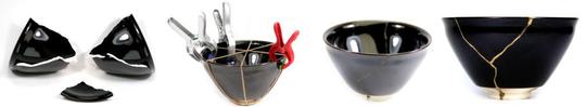 Kintsugi adalah seni kuno yang ditemukan pada abad ke- 15 di Jepang. Kata KIN berasal dari bahasa Jepang yang berarti emas, sedangkan kata TSUGI berasal dari bahasa Jepang yang berarti bergabung. Kintsugi berarti bergabung dengan emas. Pecahan dari obyek pertama-tama disusun satu persatu, dibersihkan, kemudian direkatkan satu sama lain. Retakan yang terlihat kemudian dilapisi pernis lalu ditaburi dengan emas secara hati-hati. Retakan berlapis emas itu kemudian dibakar untuk bisa memperlihatkan kecemerlangannya.